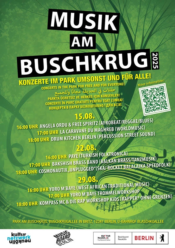 An drei Sommer-Samstagen (15., 22. und 29. August) verwandelt sich der Park am Buschkrug in Britz in eine große Bühne für Musik aus aller Welt. Von Afrobeat, Reggae und Balkan Brass über Turkish Folktronica bis zu Percussion-Workshops und Rap-Performances ist für alle etwas dabei.