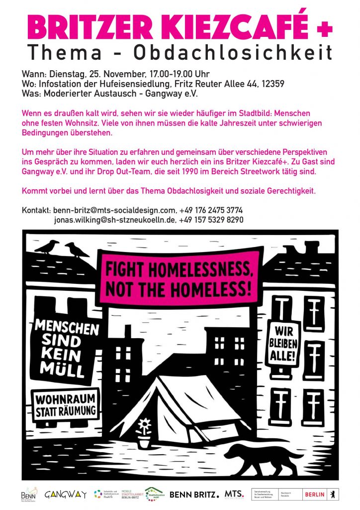 Gemeinsam mit Gangway e.V. und dem Drop Out-Team, die seit 1990 im Bereich Streetwork aktiv sind, wollen wir ins Gespräch kommen, Erfahrungen teilen und unterschiedliche Perspektiven auf das Thema Obdachlosigkeit und soziale Gerechtigkeit beleuchten.